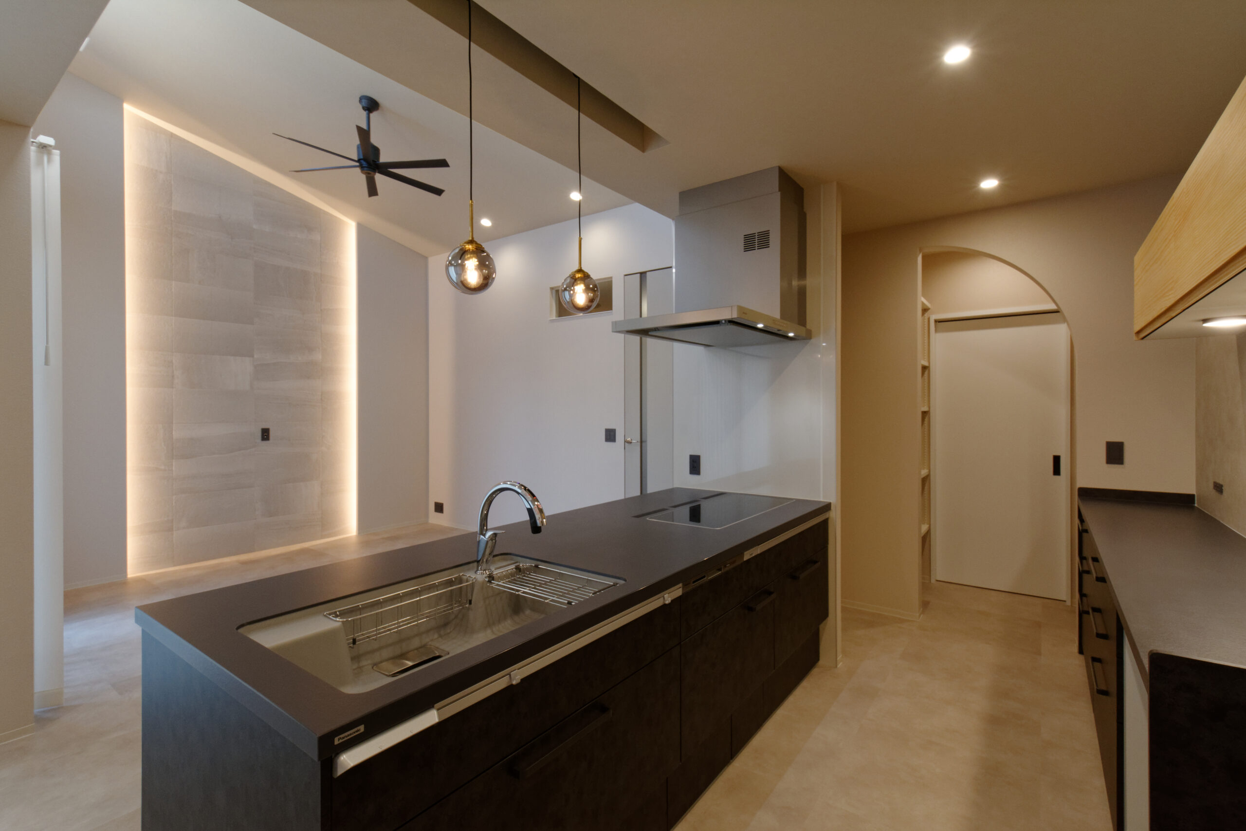 間接照明が際立つスマートなリビング・キッチン